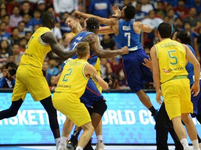 مسابقه فیلیپین و استرالیا تا چهار دقیقه به پایان کوارتر سوم با اختلاف به نفع استرالیا پیش می‌رفت که دنیل کیکرت بازیکن استرالیا با آرنج ضربه محکمی به بازیکن فیلیپینی زد و همه نیمکت نشینان فیلیپین برای دفاع از هم تیمی خود به زمین حمله کردند.