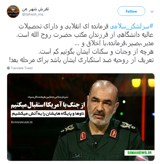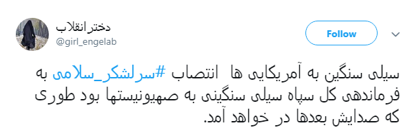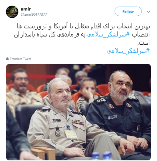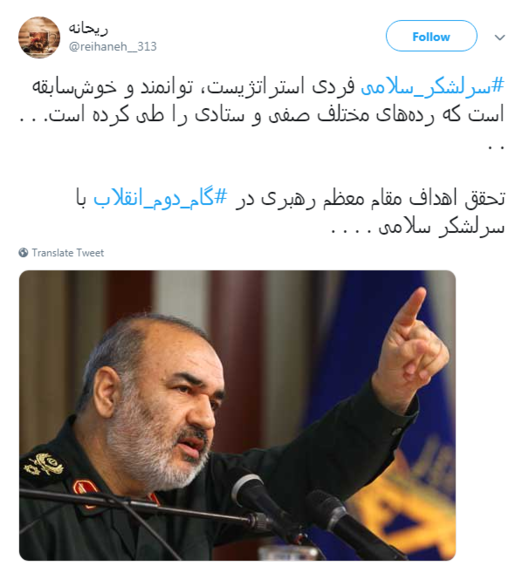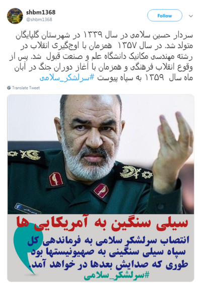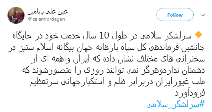 به گزارش سرويس فضاي مجازي خبرگزاري صدا و سيما؛ کاربران فضای مجازی در واکنش به انتخاب سردار حسین سلامی به عنوان هشتمین فرمانده کل سپاه پاسداران انقلاب اسلامی توسط رهبر معظم انقلاب هشتگ #سرلشکر_سلامی را داغ کردند.