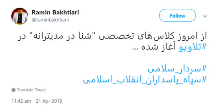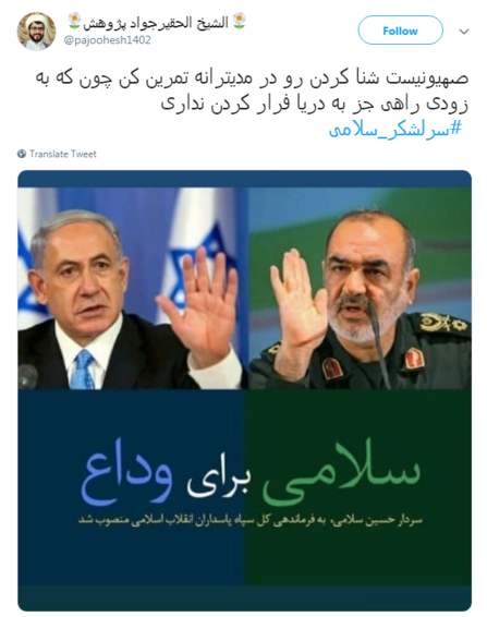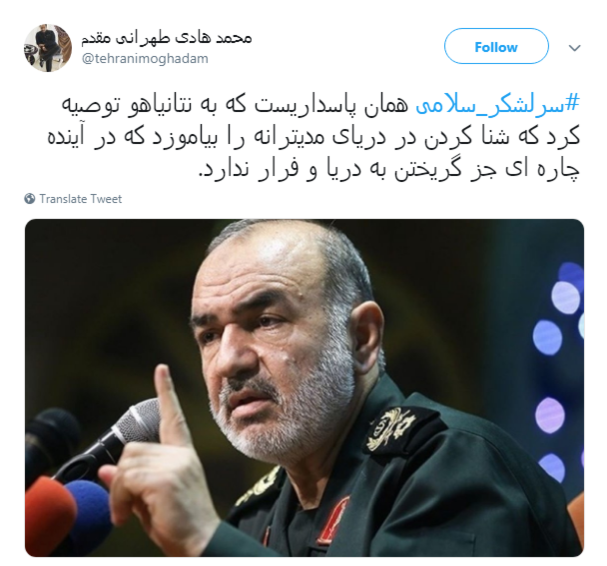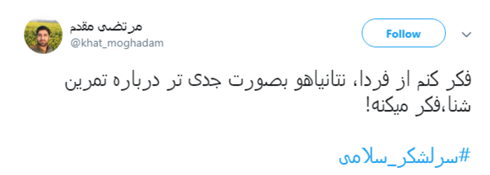 در پی انتصاب فرمانده جدید کل سپاه پاسداران انقلاب اسلامی کاربران هشتگ #سرلشکر_سلامی را داغ کردندو نوشتند:‌ از فردا نتانياهو جدی‌تر به تمرین شنا فکر می‌کند.
