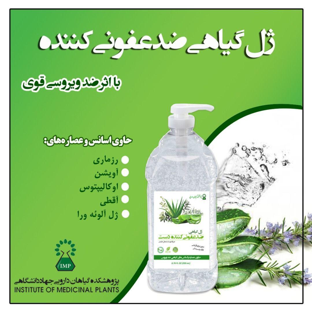 *تولید ژل گیاهی ضدعفونیکننده با اثر ضدویروسی قویبا تلاش محققان پژوهشکده گیاهان دارویی جهاددانشگاهی، ژل گیاهی ضدعفونی کننده آنی حاوی اسانسها و عصارههای گیاهان رُزماری (Rosemary)، آویشن (Thyme)، اکالیپتوس (Eucalyptus)، آقطی (Sambucus) و ژل آلوئهورا (Aloe vera) فرموله شده و این محصول پس از طی موفقیتآمیز مراحل آزمایشگاهی، اکنون در مرحلهی تولید نیمهصنعتی قرار گرفته است.