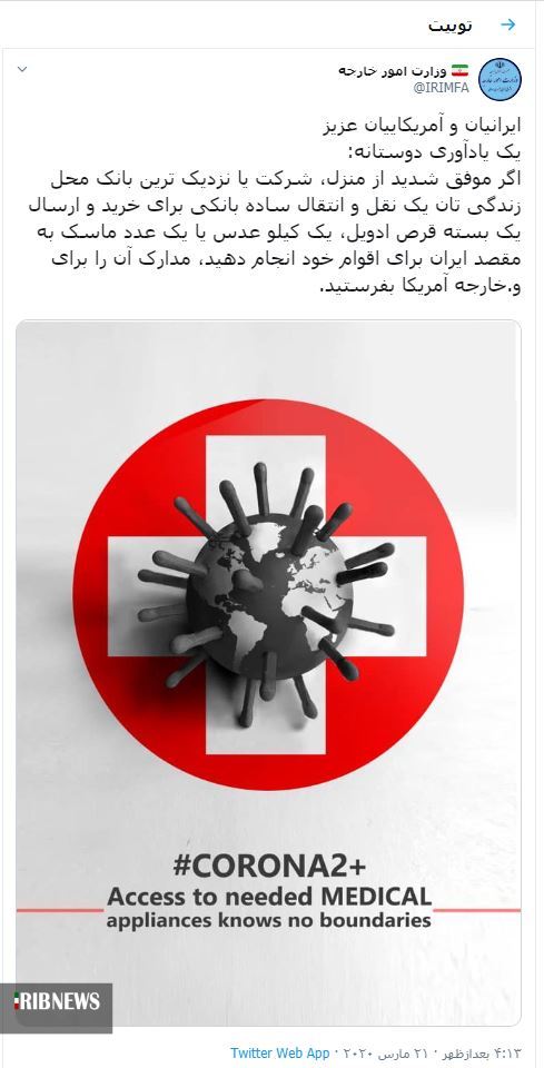 به گزارش سرویس بین الملل خبرگزاری صداوسیما ، وزارت امور خارجه جمهوری اسلامی ایران در صفحه توئیترش و در پاسخ به ادعای آمریکاییها که گفتهاند غذا، دارو و کمکهای بشردوستانه تحریم نیستند، نوشت: «ایرانیان و آمریکاییهای عزیز یک یادآوری دوستانه: اگر موفق شدید از منزل، شرکت یا نزدیکترین بانک محل زندگیتان یک نقل و انتقال ساده بانکی برای خرید و ارسال یک بسته قرص ادویل، یک کیلو عدس یا یک عدد ماسک به مقصد ایران برای اقوام خود انجام دهید، مدارک آن را برای وزارت خارجه آمریکا بفرستید.» یادآوری میشود صفحه توئیتر فارسی وزارت امور خارجه آمریکا پیش از این با ارسال پیامی نوشته بود: «ایرانیان عزیز، یک یادآوری دوستانه: غذا، دارو و کمکهای بشردوستانه تحریم نیستند.»
