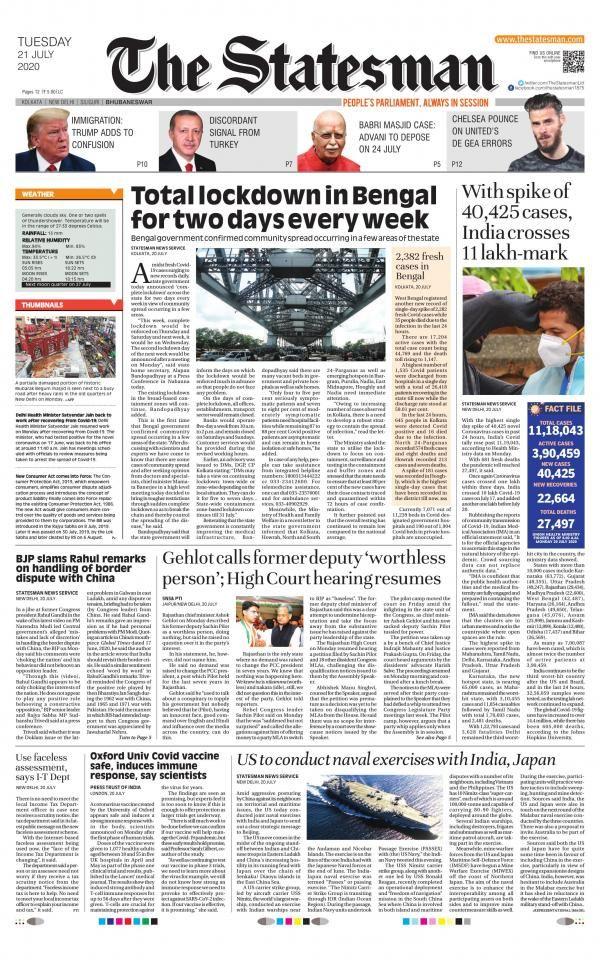 - اعلام دولت ایالت بنگال غربی برای برنامه قرنطینه به مدت دو در روز در هر هفته در این ایالت