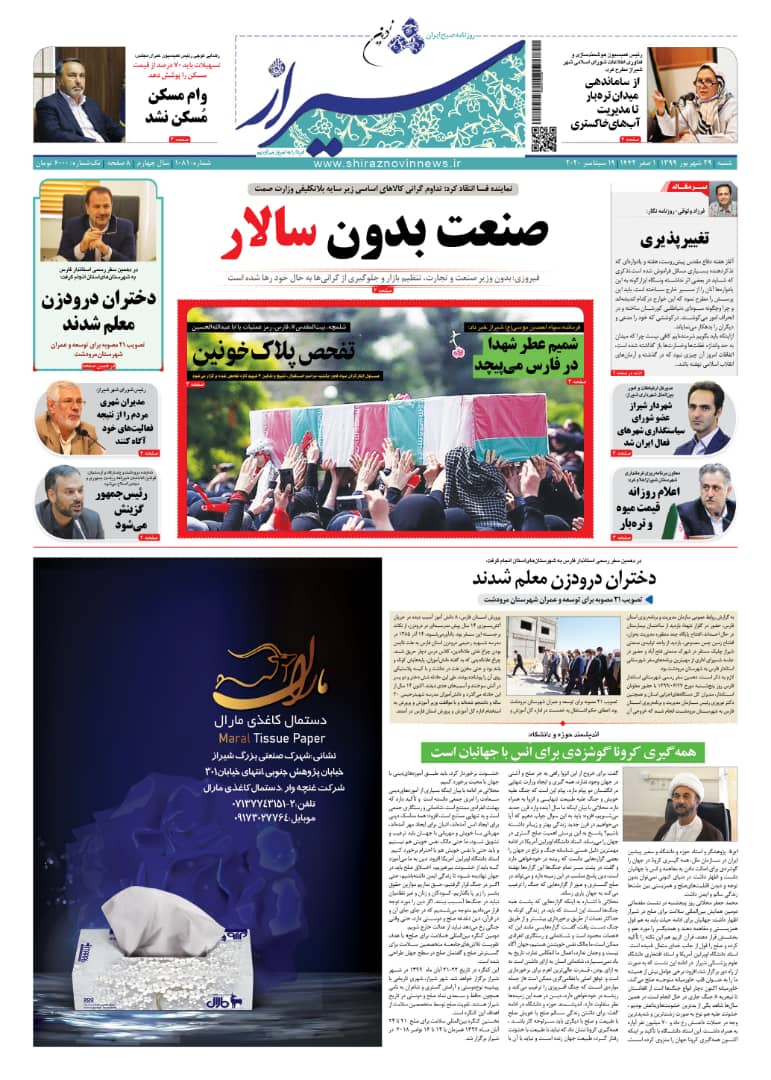 به گزارش خبرگزاری صدا و سیما، مرکز فارس، صفحات نخست روزنامه‌های امروز بیست و نهم شهریور فارس را ببینید.
