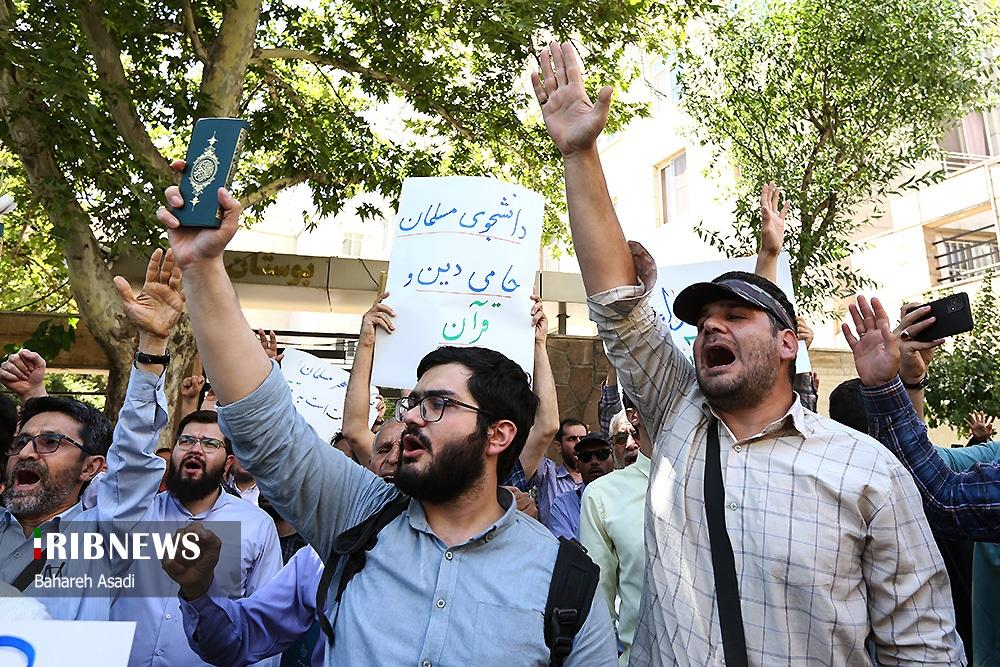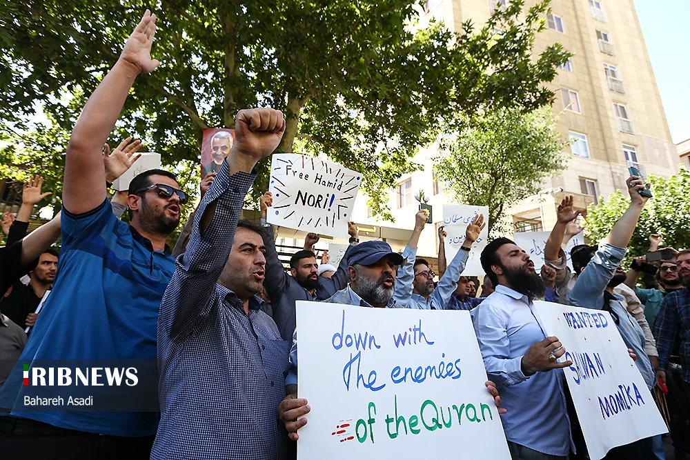 جمعی از مردم و دانشجویان در اعتراض به اهانت به قرآن کریم در سوئد، جمعه ۹ تیر ۱۴۰۲ مقابل سفارت این کشور در تهران تجمع کردند.