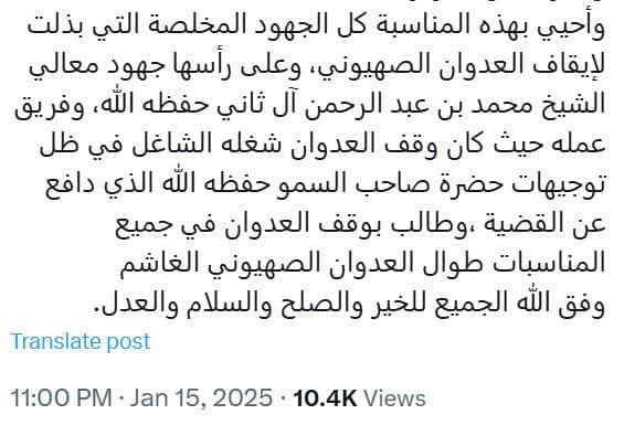 «عبدالله بن حسین» (عبدالله دوم)، شاه اردن، در یادداشتی در شبکه اجتماعی «ایکس» نوشت: از اعلام آتش بس در غزه استقبال میکنیم و از کشورهای جهان میخواهیم تلاش خود را برای کاهش پیامدهای فاجعه بار جنگ دوچندان، و کمکهای بشردوستانه را بیشتر کنند. از نقش مصر، قطر و ایالات متحده قدردانی و تاکید میکنیم آتش بس باید ادامه پیدا کند. اردن به حمایت از مردم فلسطین، کمک رسانی و تلاش برای برقراری صلح ادامه میدهد.